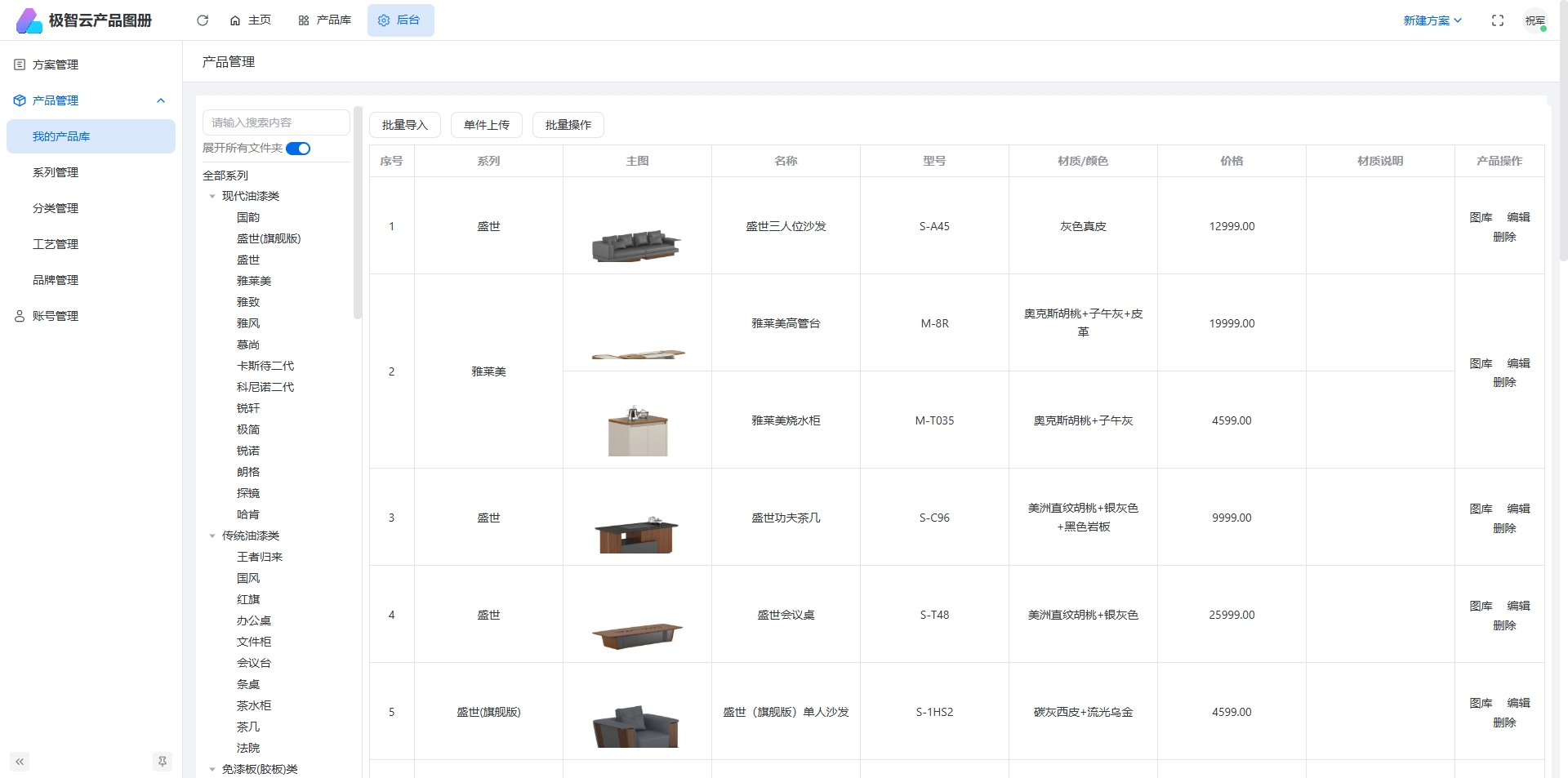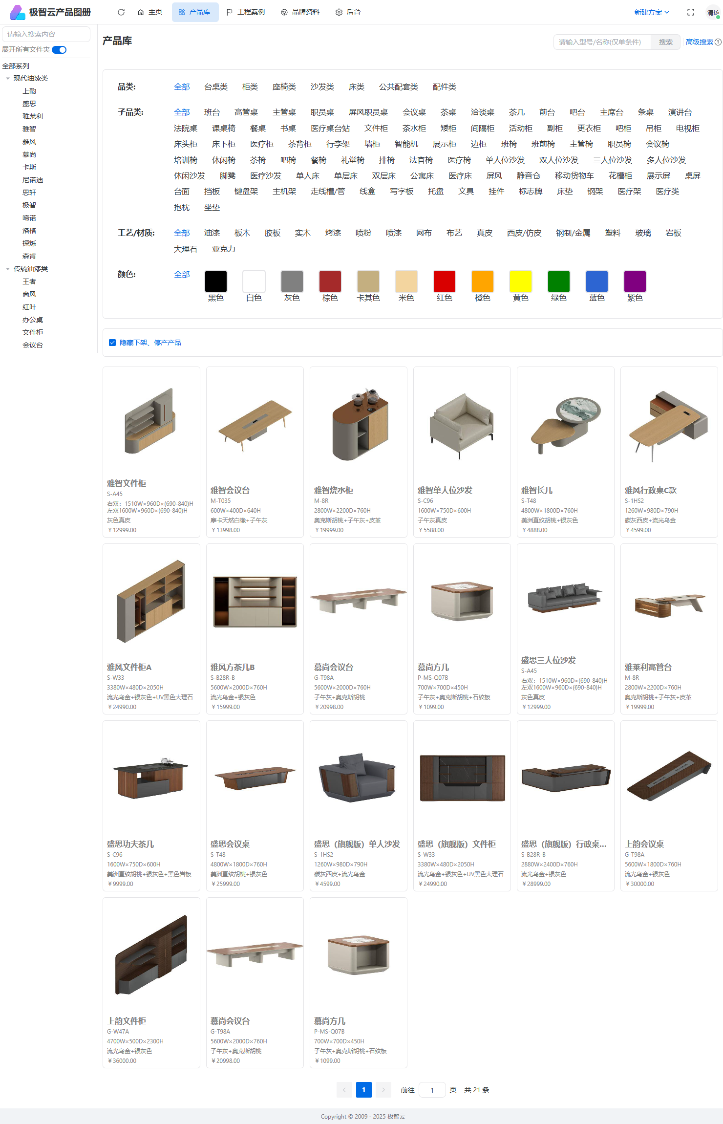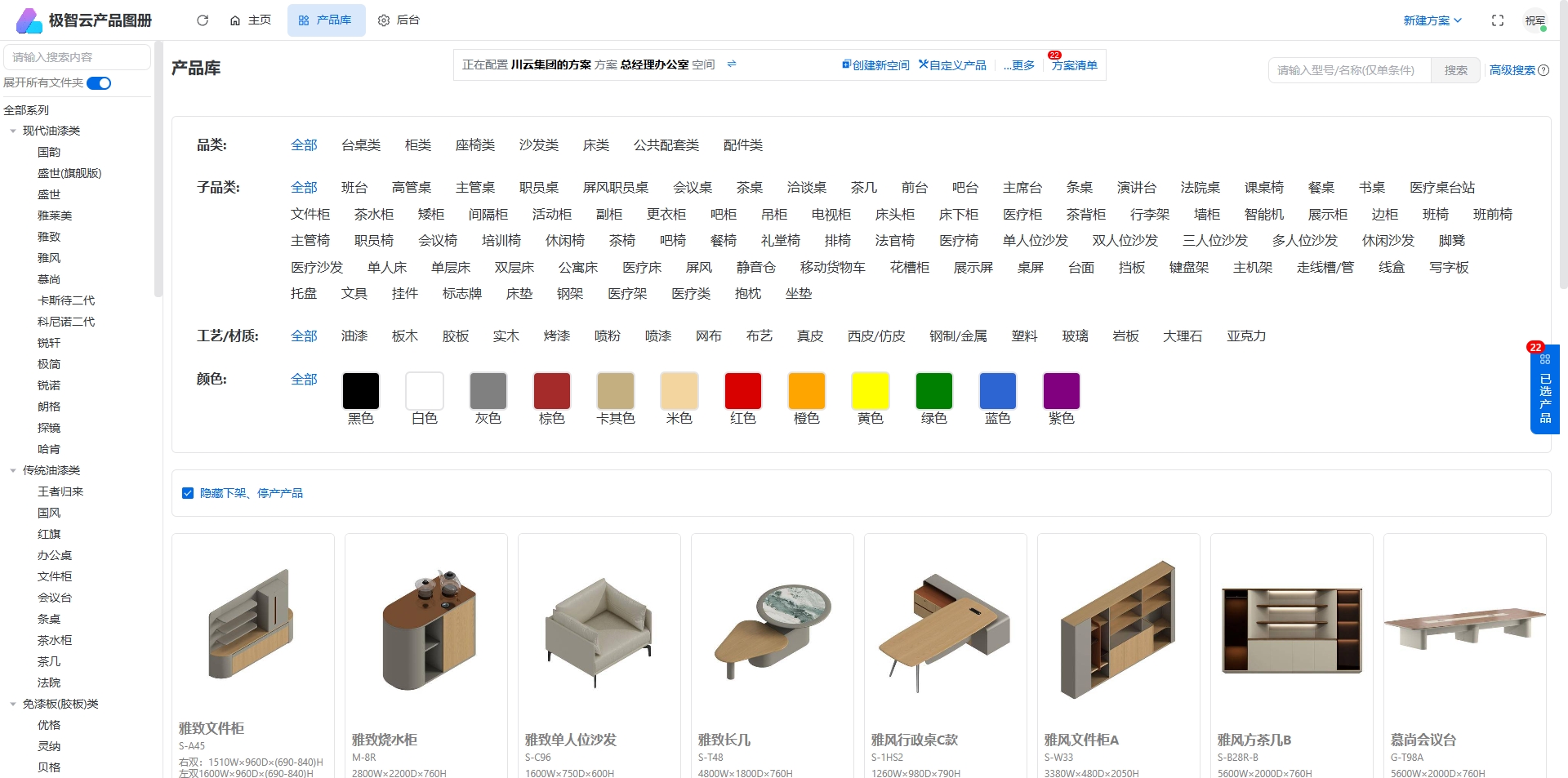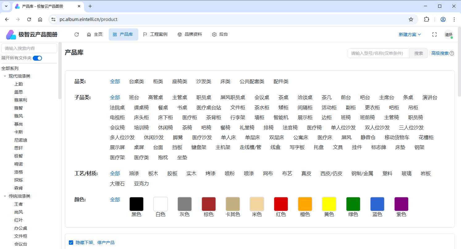 | 产品 | 产品库 | 左侧文件夹。过虑选项:品类、子品类、工艺/材质、适配空间、销售状态、高级选项(颜色、系列)。搜索框:输入型号/名称。高级搜索。 |