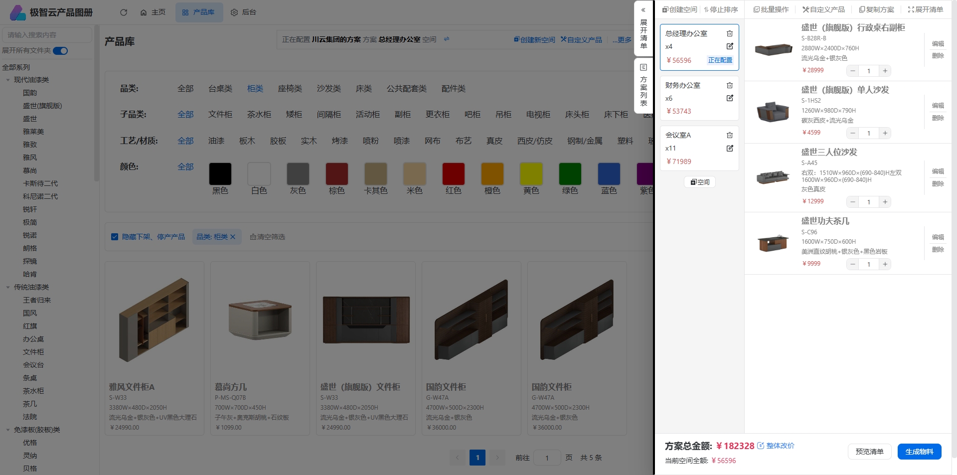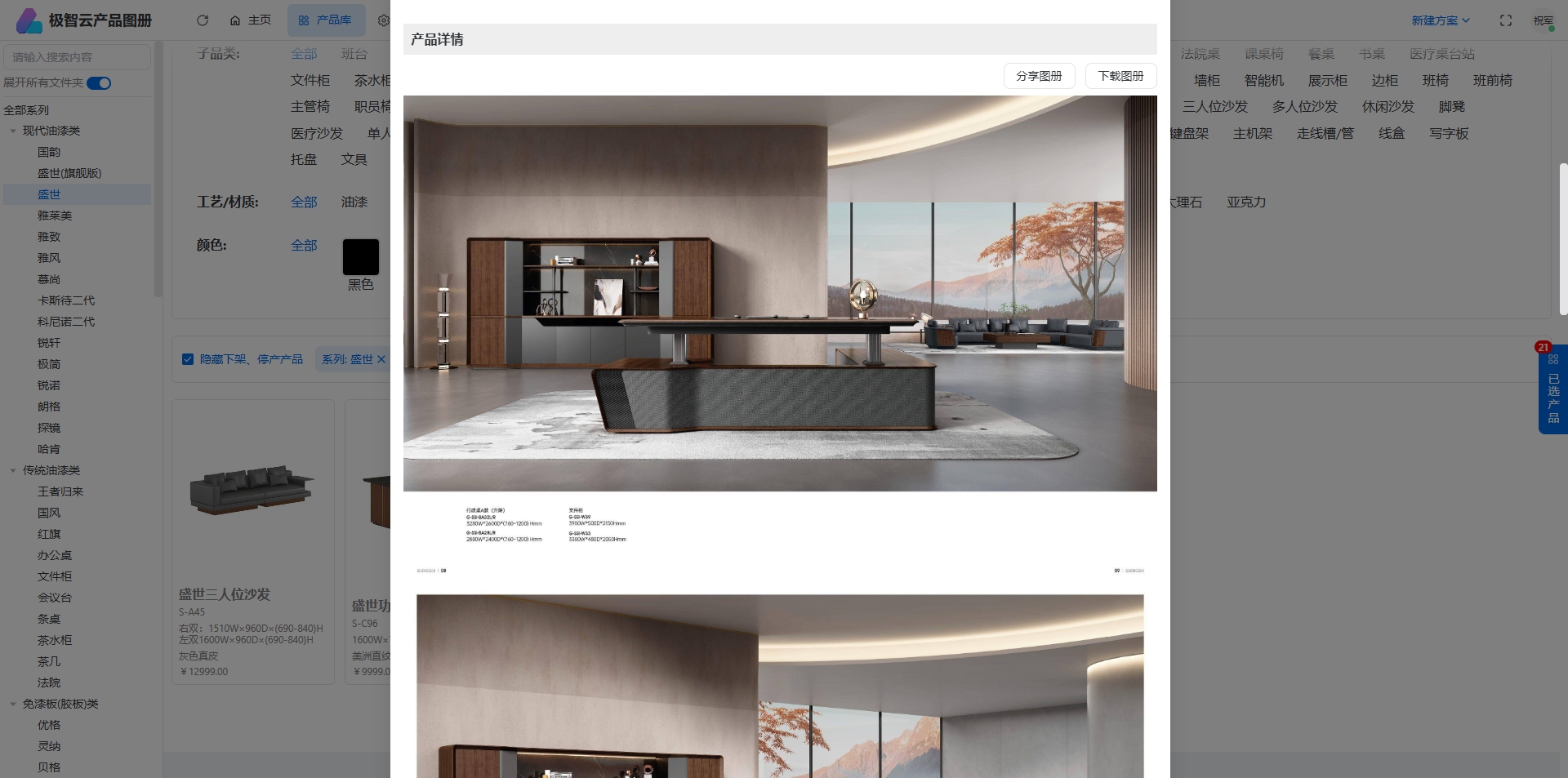 | 产品 | 产品详情 | 产品基础信息展示,不同规格选择,介绍视频播放,看产品大图,产品图库(效果图、实拍图、产品图、同系列效果图),搭配组合-高管空间,产品资料,系列相关资料,下载图册(将图片生成到PDF文件下载),空间灵感,空间灵感方案推荐产品,方案产品批量下单,相似产品。 |
