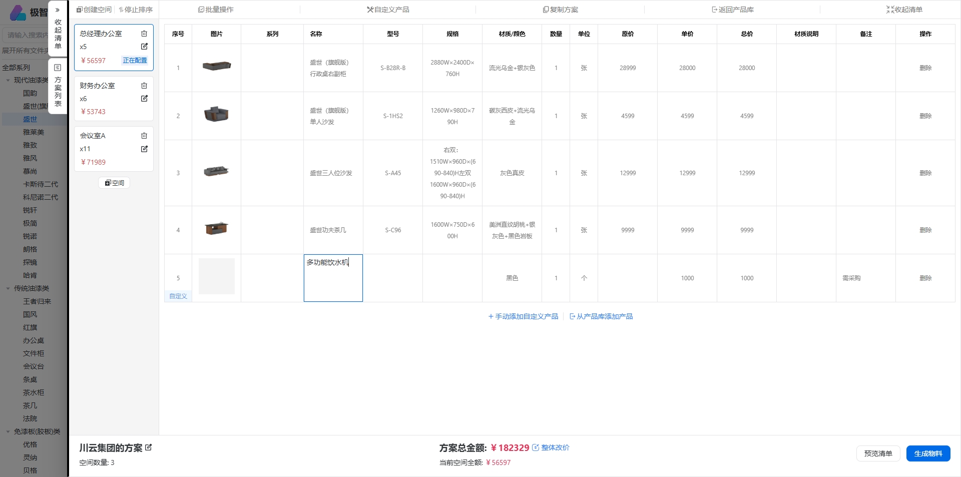 | 方案 | 创建方案 | 添加区域/空间,空间添加产品,编辑产品数量,编辑产品价格,产品定制(规格、尺寸等),添加自定义产品,生成报价清单,导出报价清单excel,分享报价清单。生成物料(报价清单excel、PPT) |