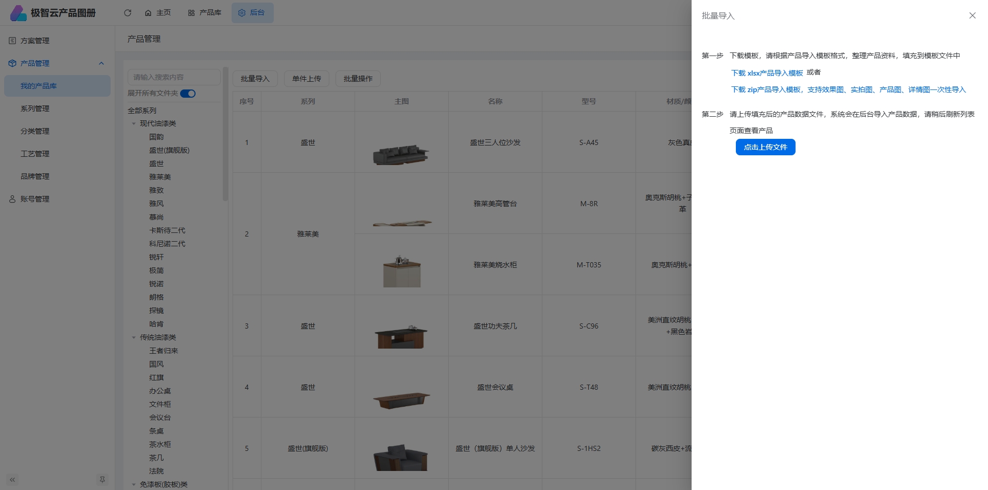 | 产品 | 我的产品库 | 上传细节图,上传场景图,上传系列表图册 |