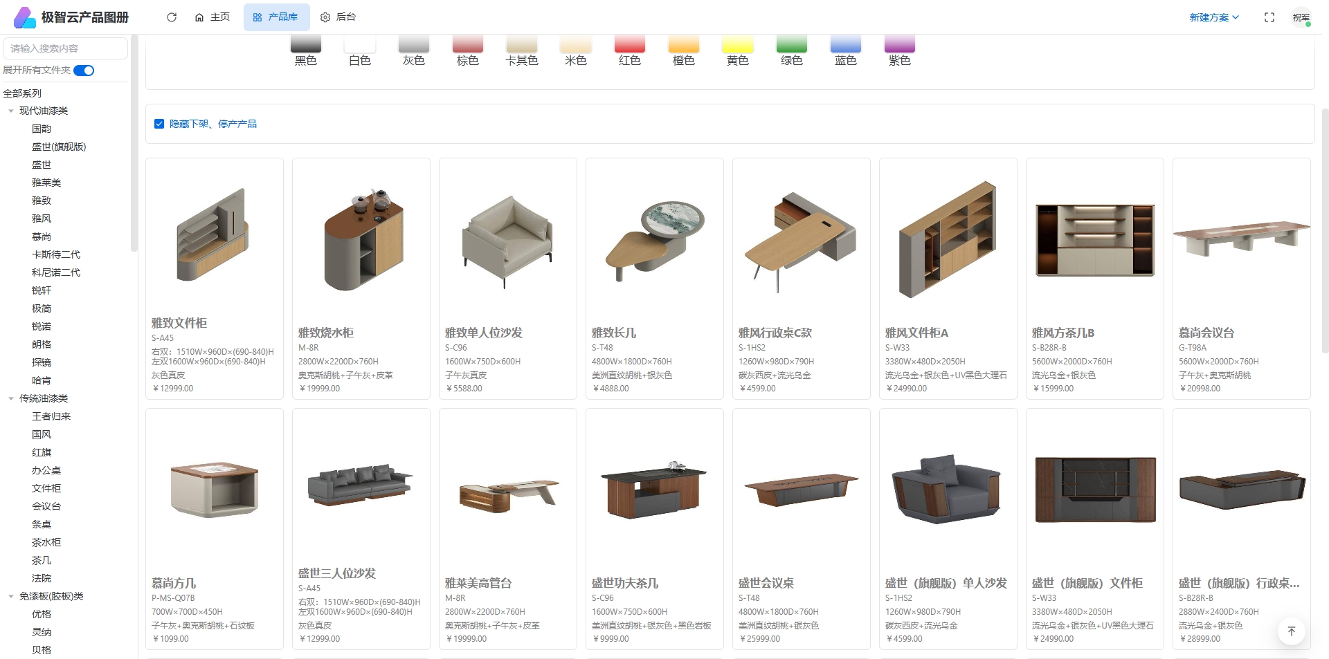 | 产品 | 产品库 | 左侧文件夹。过虑选项:品类、子品类、工艺/材质、适配空间、销售状态、高级选项(颜色、系列)。搜索框:输入型号/名称。高级搜索。 |