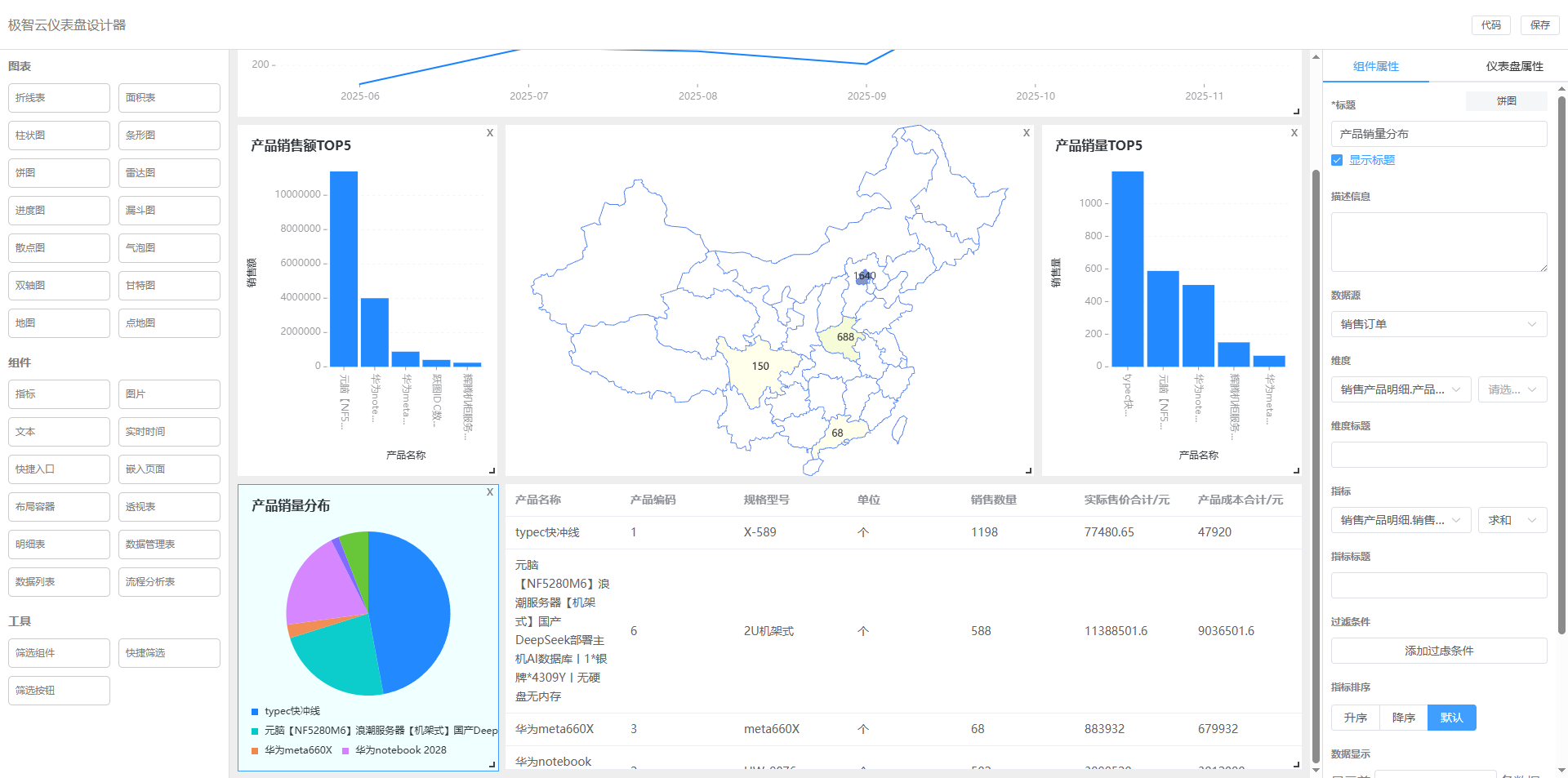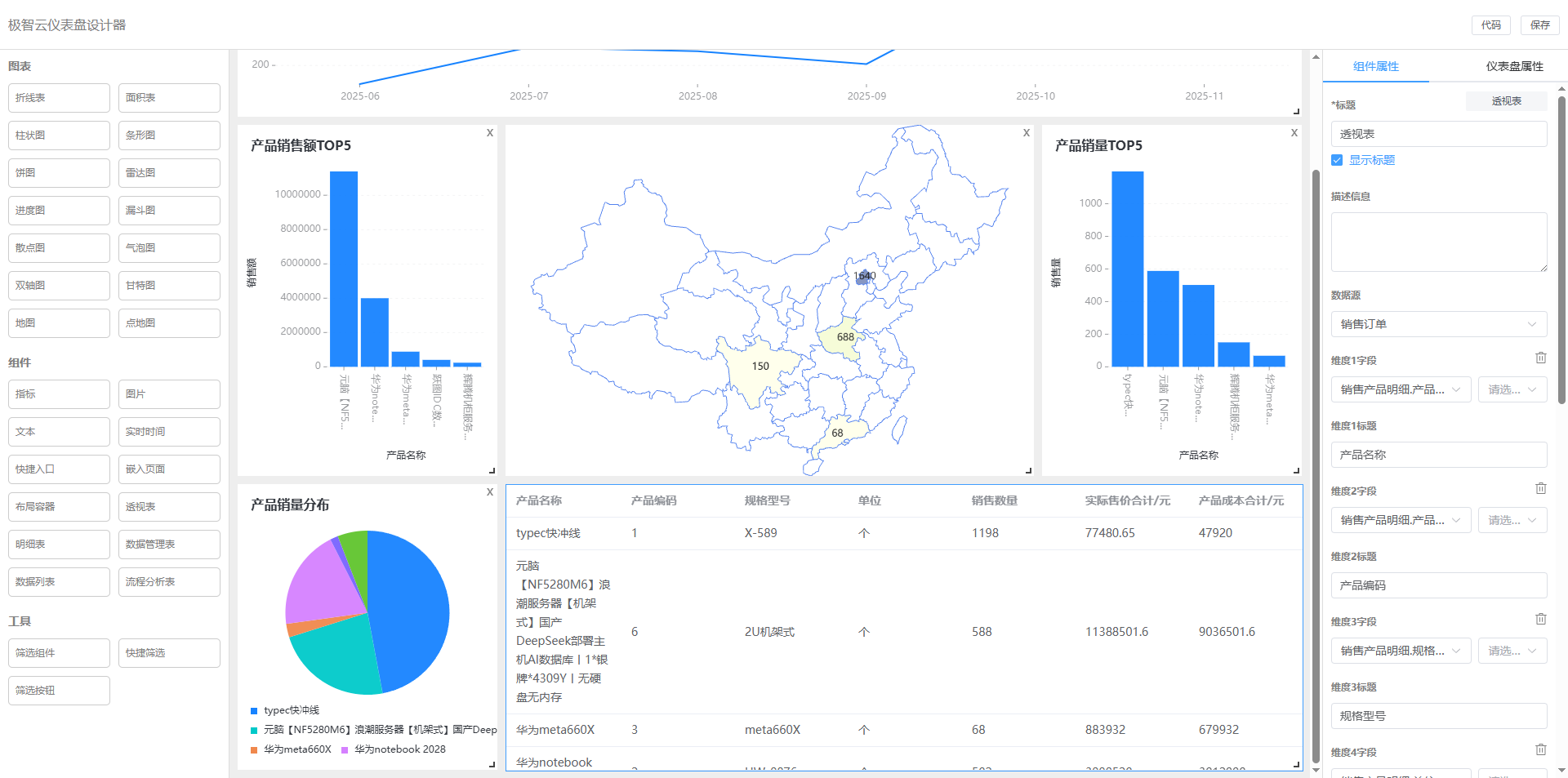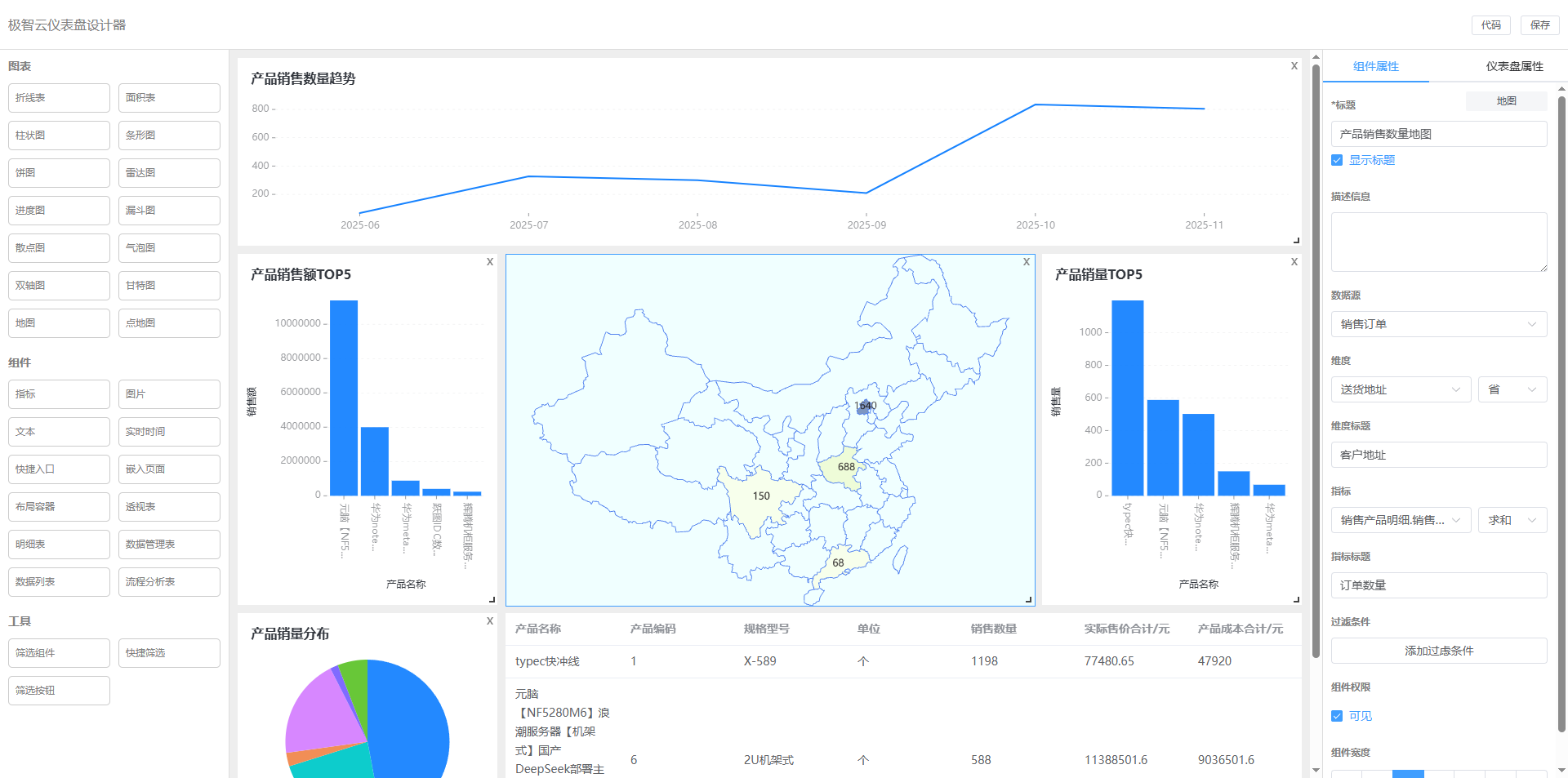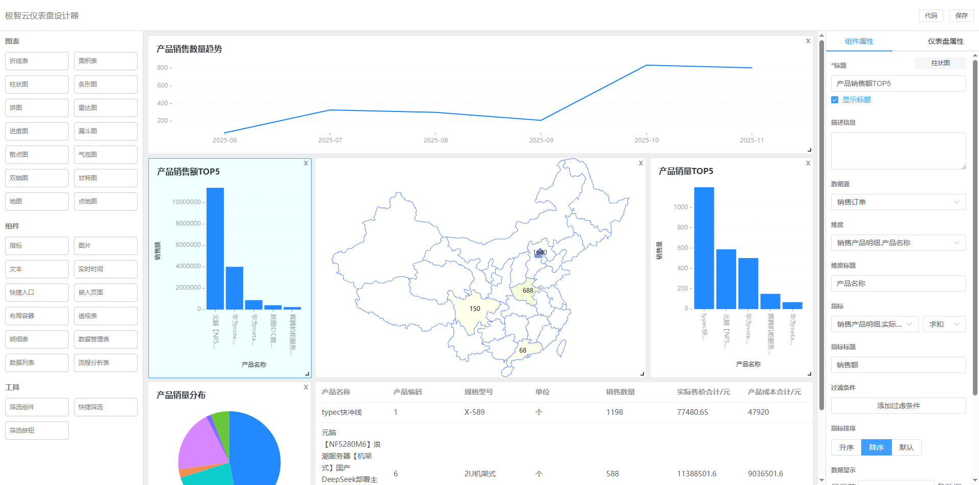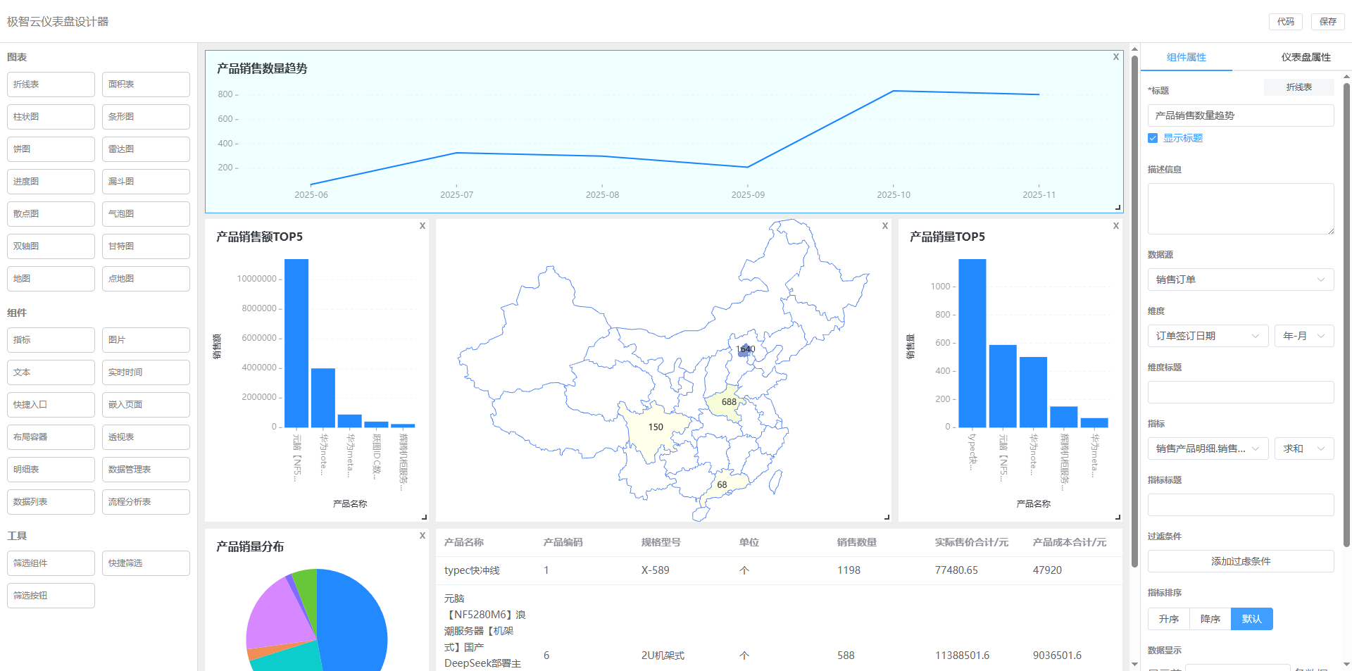 组件:指标、图片、文本、实时时间、快捷入口、嵌入页面、布局容器、透视表、明细表、数据管理表、数据列表、流程分析表。