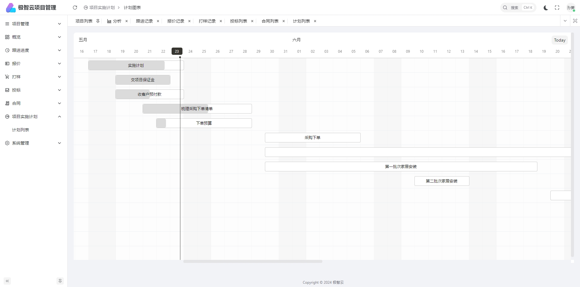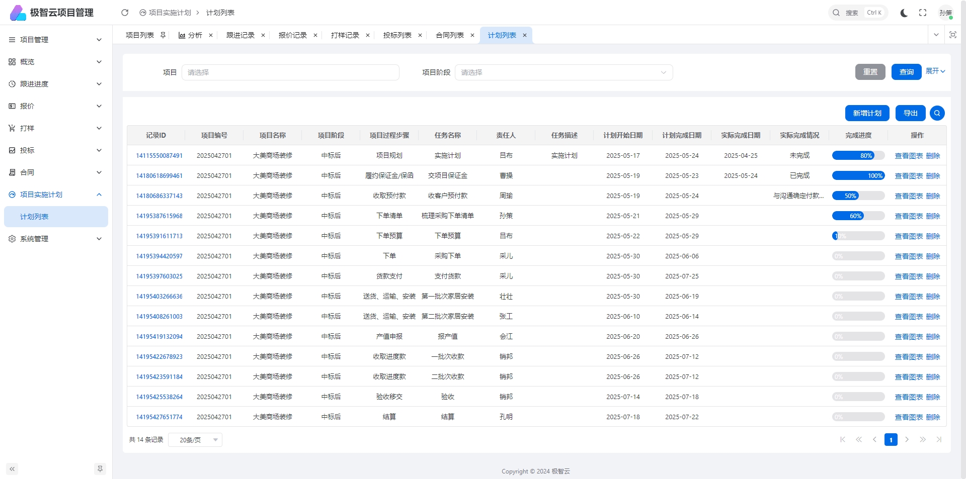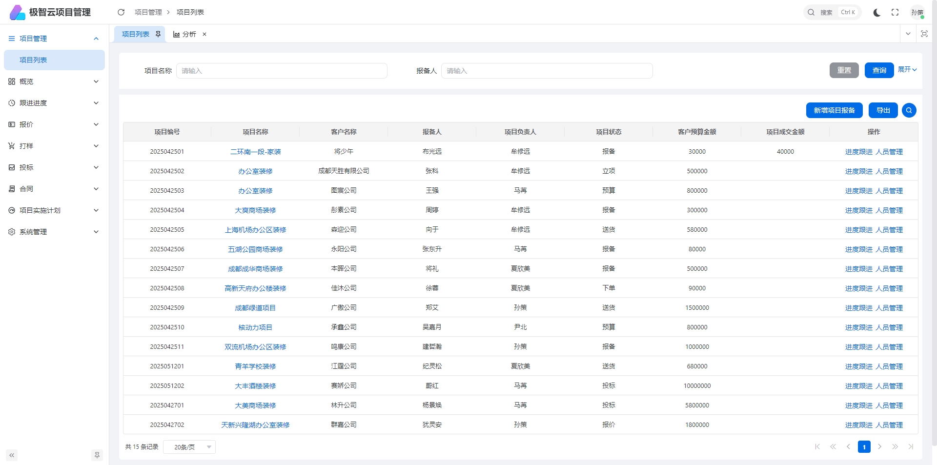 项目全链路生命周期管理,从客户报备,售前跟进,报价,合同。到项目计划,实施,收款,结算。做到项目生命周期全链路数字化智能闭环管理。