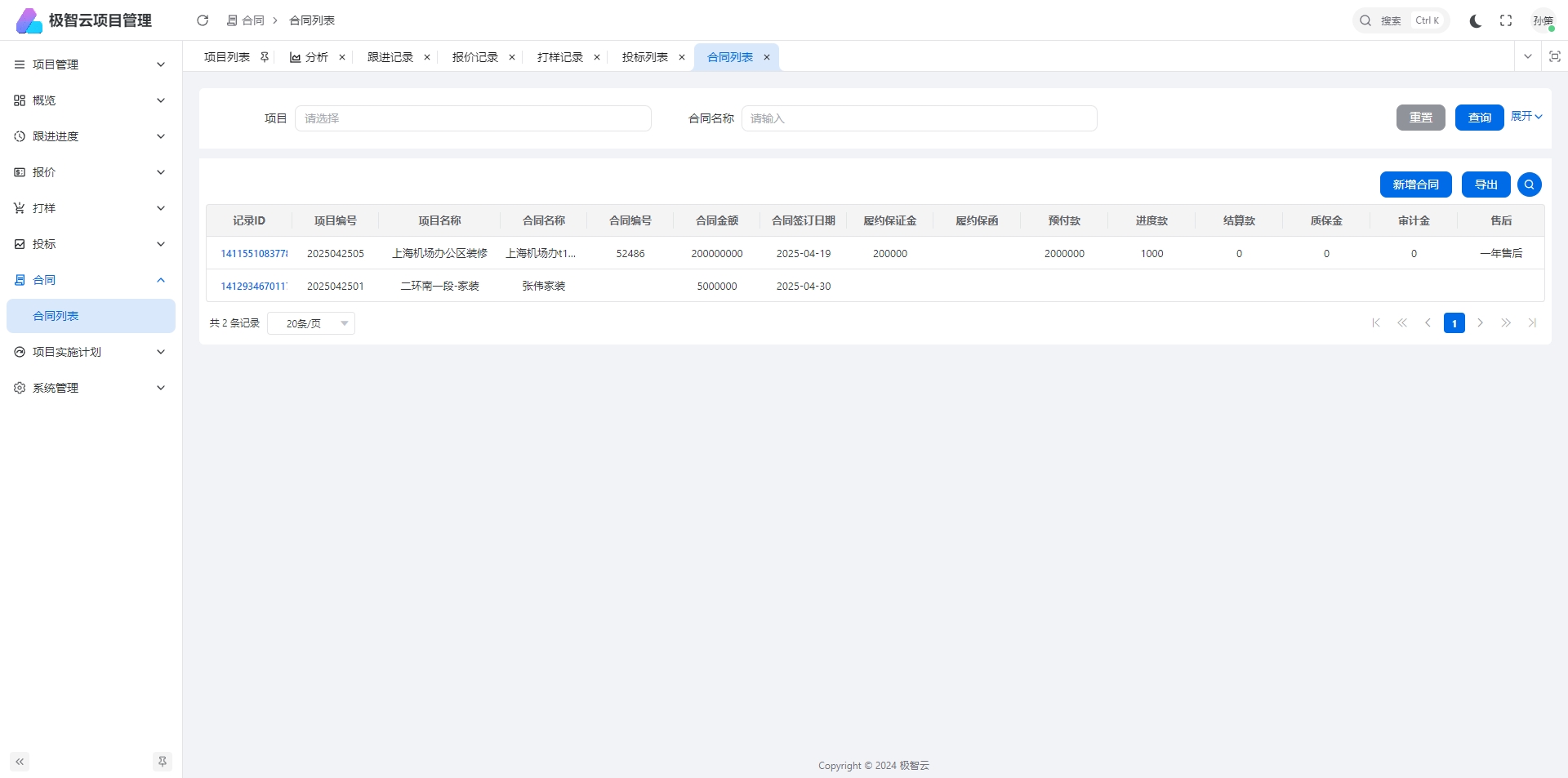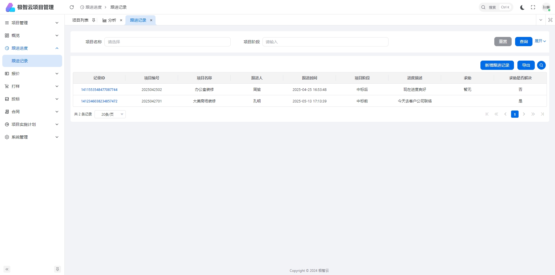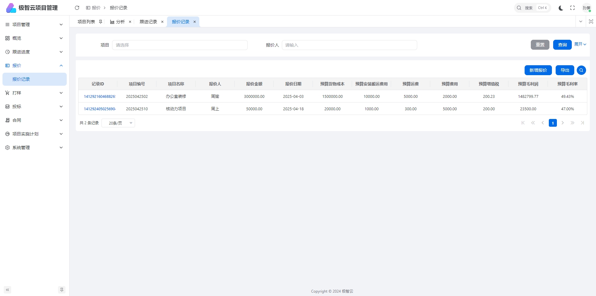 项目全链路生命周期管理,从客户报备,售前跟进,报价,合同。到项目计划,实施,收款,结算。做到项目生命周期全链路数字化智能闭环管理。